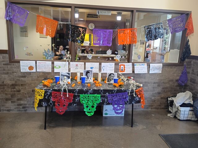 Our Spanish IV students —Reagan, Kyra, and Kaitlynn — created a colorful Día de los Muertos display to share this special cultural tradition.